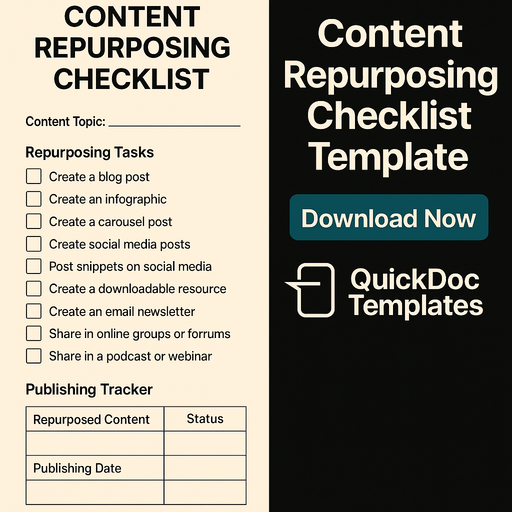 Whether you’re a content creator, social media manager, freelancer, or agency, this checklist helps you track repurposing tasks and manage your publishing schedule with ease.