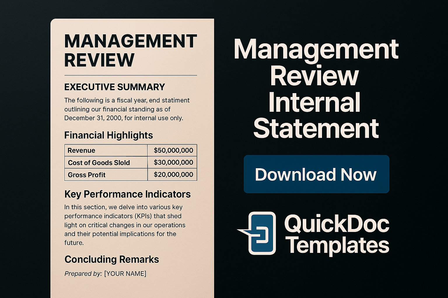 Keep your organization aligned and informed with this Management Review Statement Template, a professionally formatted document used for internal financial reporting and year-end analysis. Designed for executive and managerial use, this editable Word template is ideal for summarizing key financial data, highlighting performance indicators, addressing organizational challenges, and outlining opportunities.